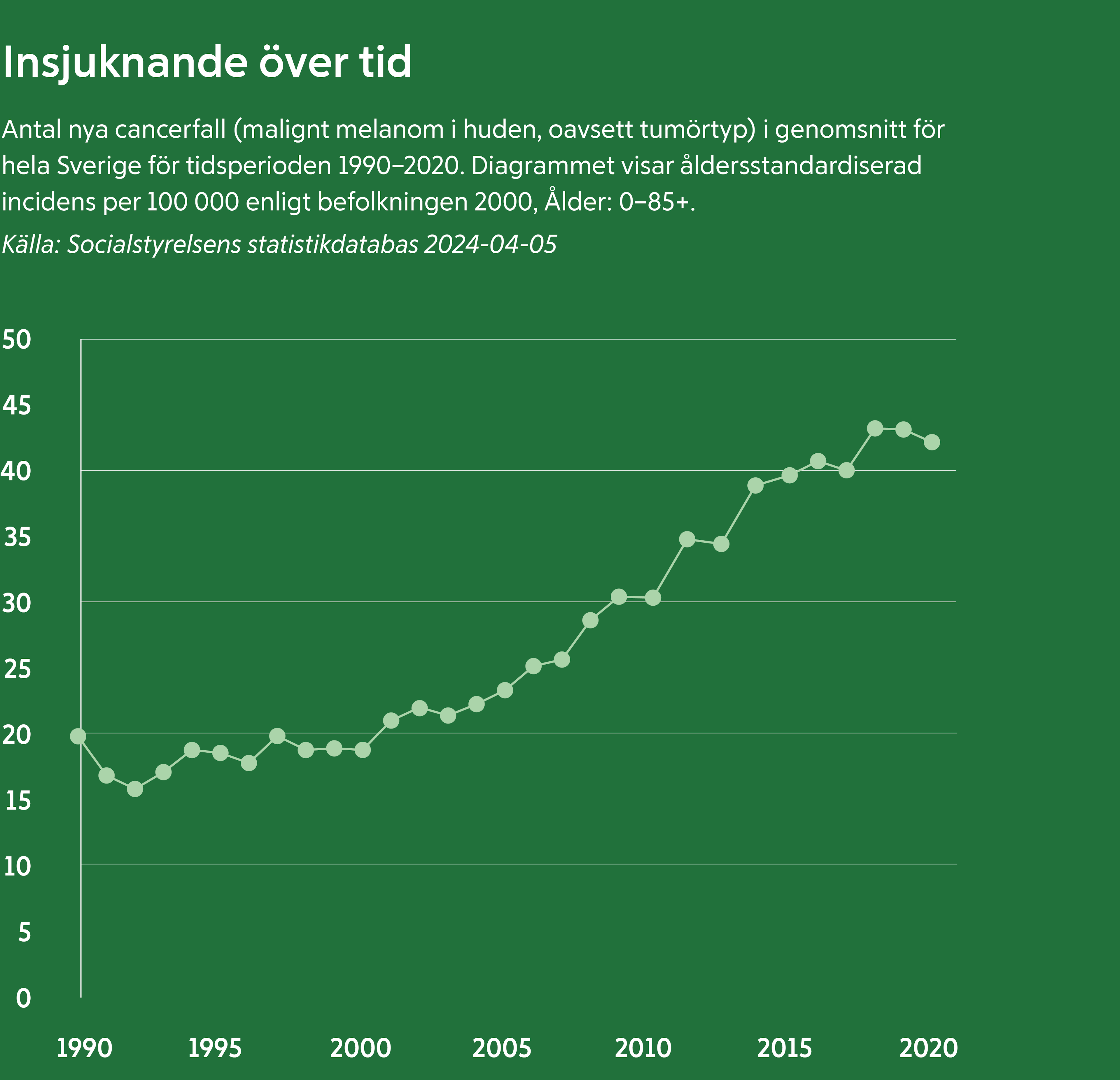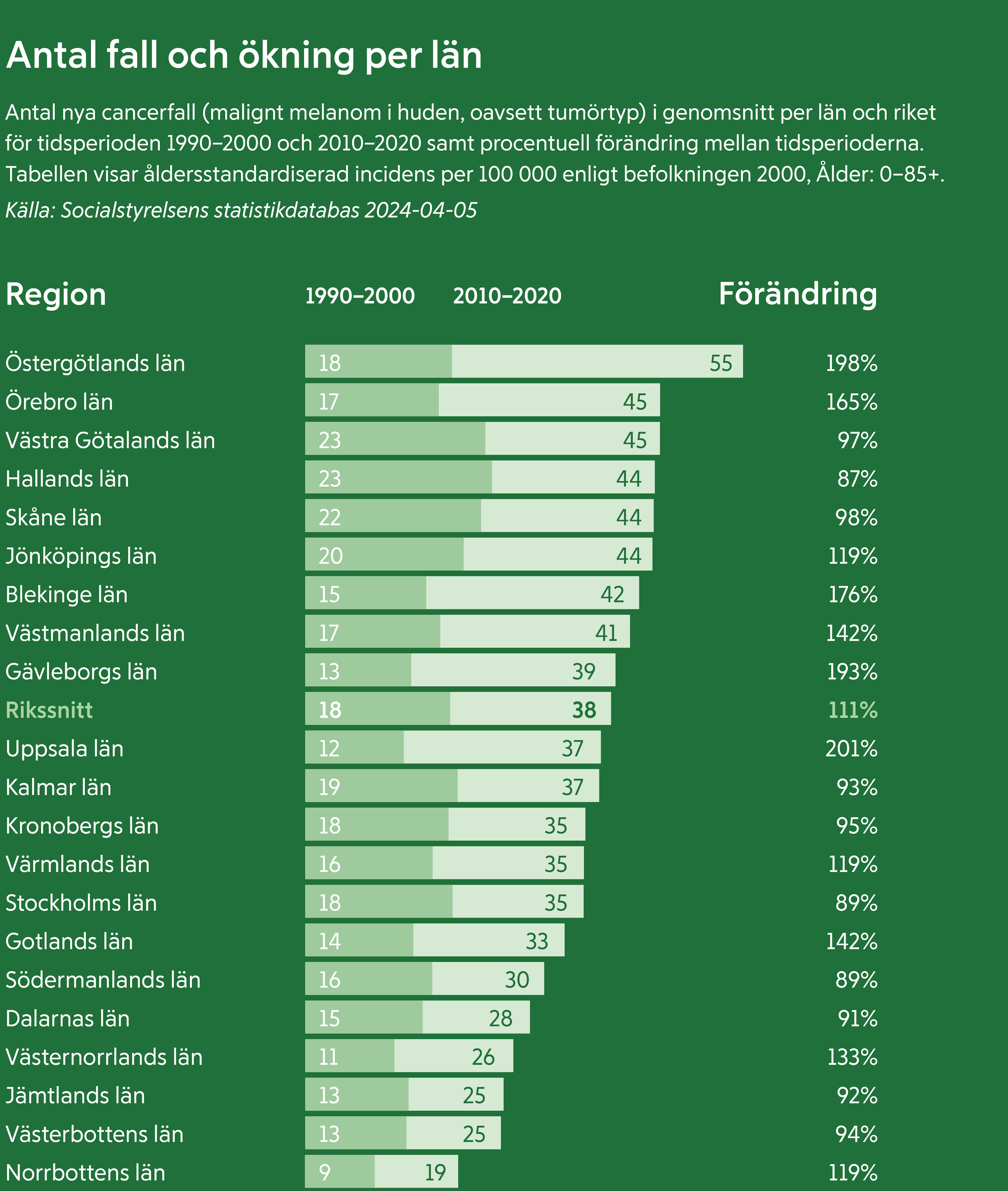 Trots att mängden sol skiljer sig avsevärt mellan olika delar av landet, ökar antalet fall av hudcancer tydligt – och snabbt – i alla län. I vissa län har antalet fall av malignt melanom nära tredubblats under tidsperioden 2010–2020 jämfört med 1990–2000. Bland andra sticker län som Uppsala, Östergötland och Gävleborg ut.